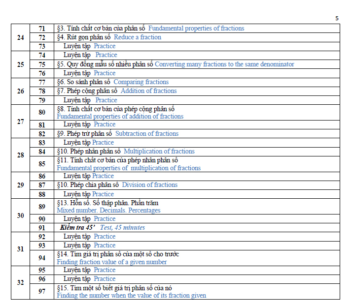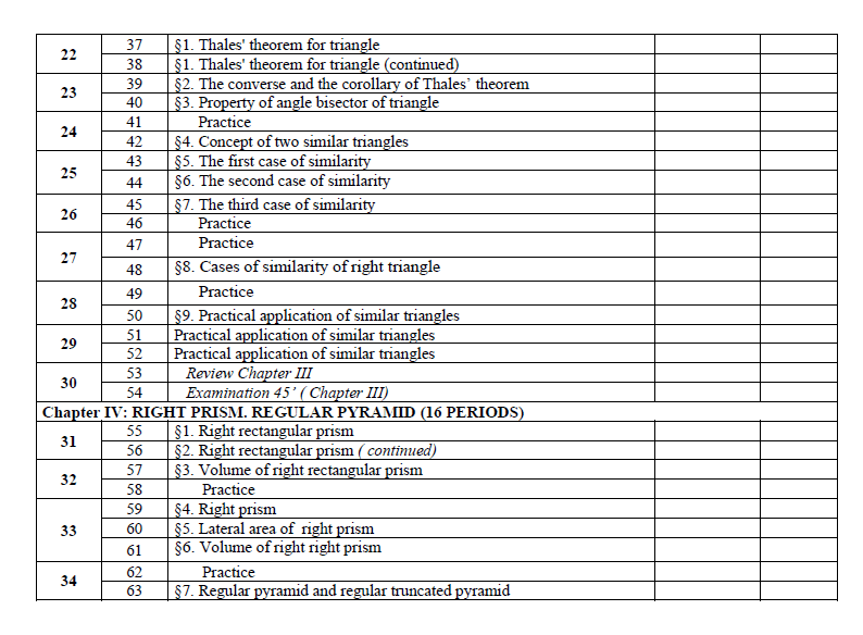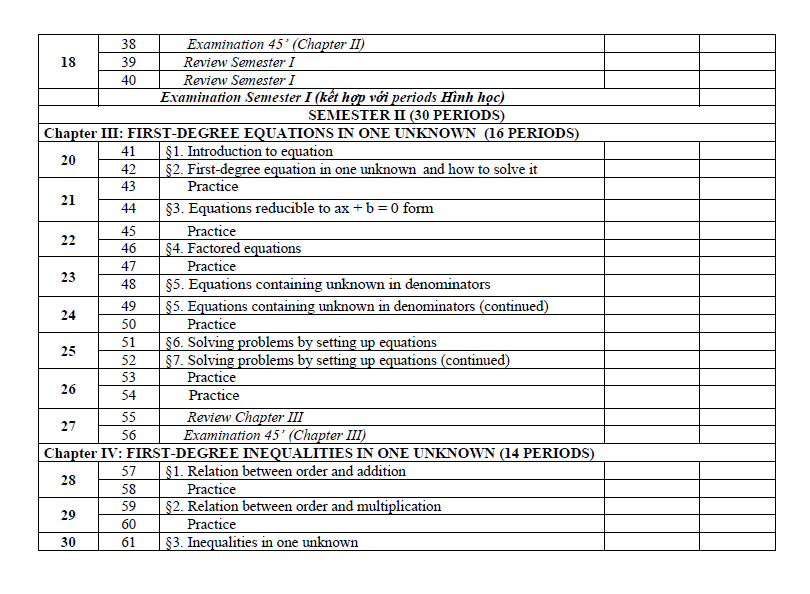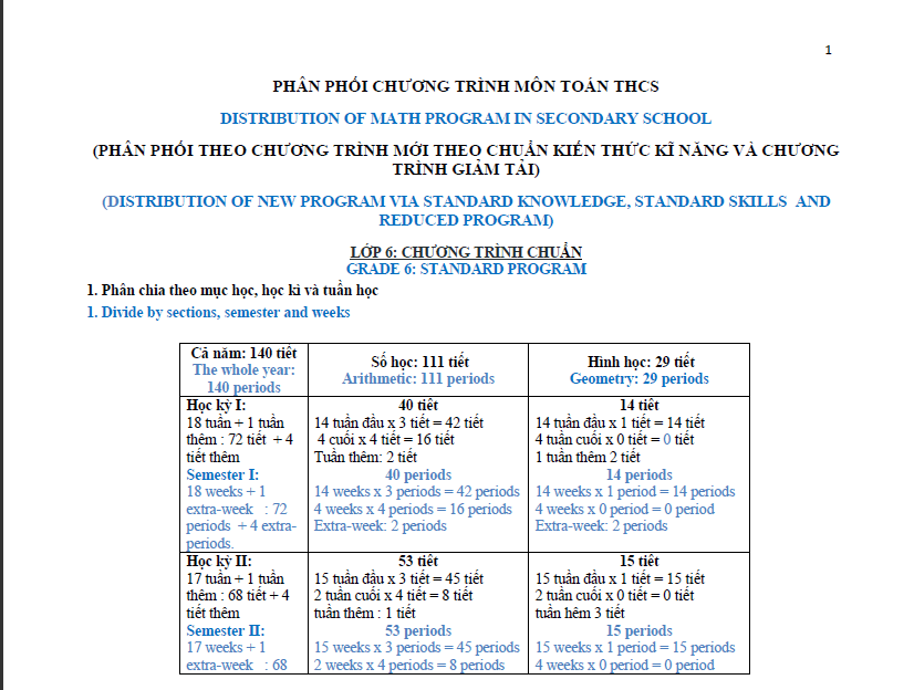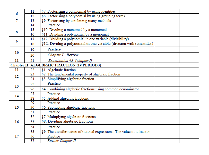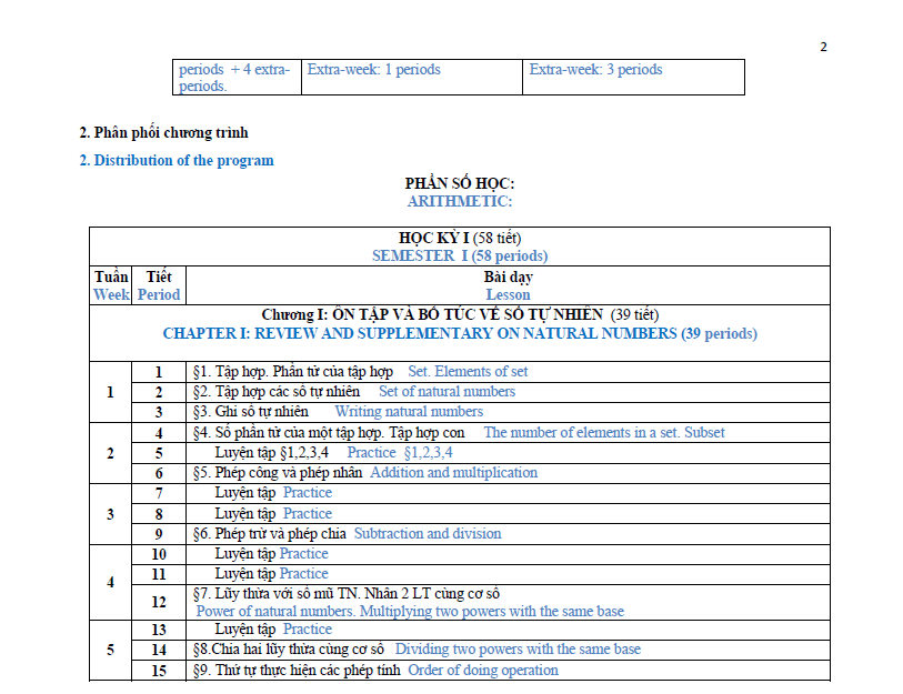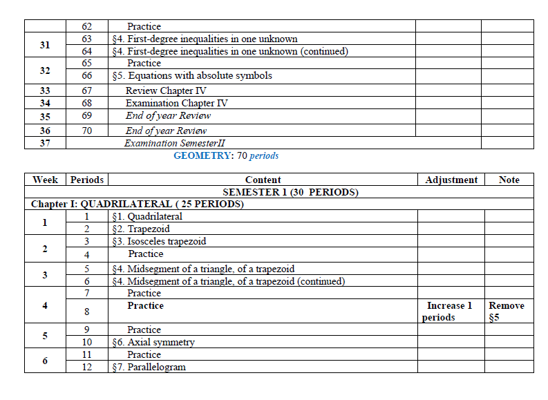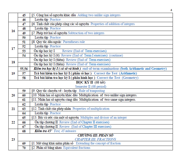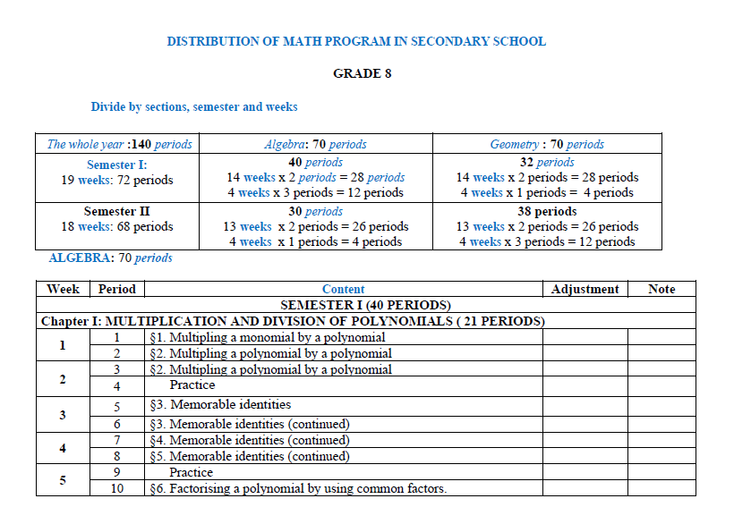 On Middle and secondary curriculum, all subjects are compulsory for students. Such as: Literature, Mathematics, Physics, Chemistry (from year 8 on wards), Biology, History, Geography, Civics, Foreign language, Technology, Information Technology, Physical Education (P.E), and Military education and training. For Mathematics subjects the division of material is as follows: