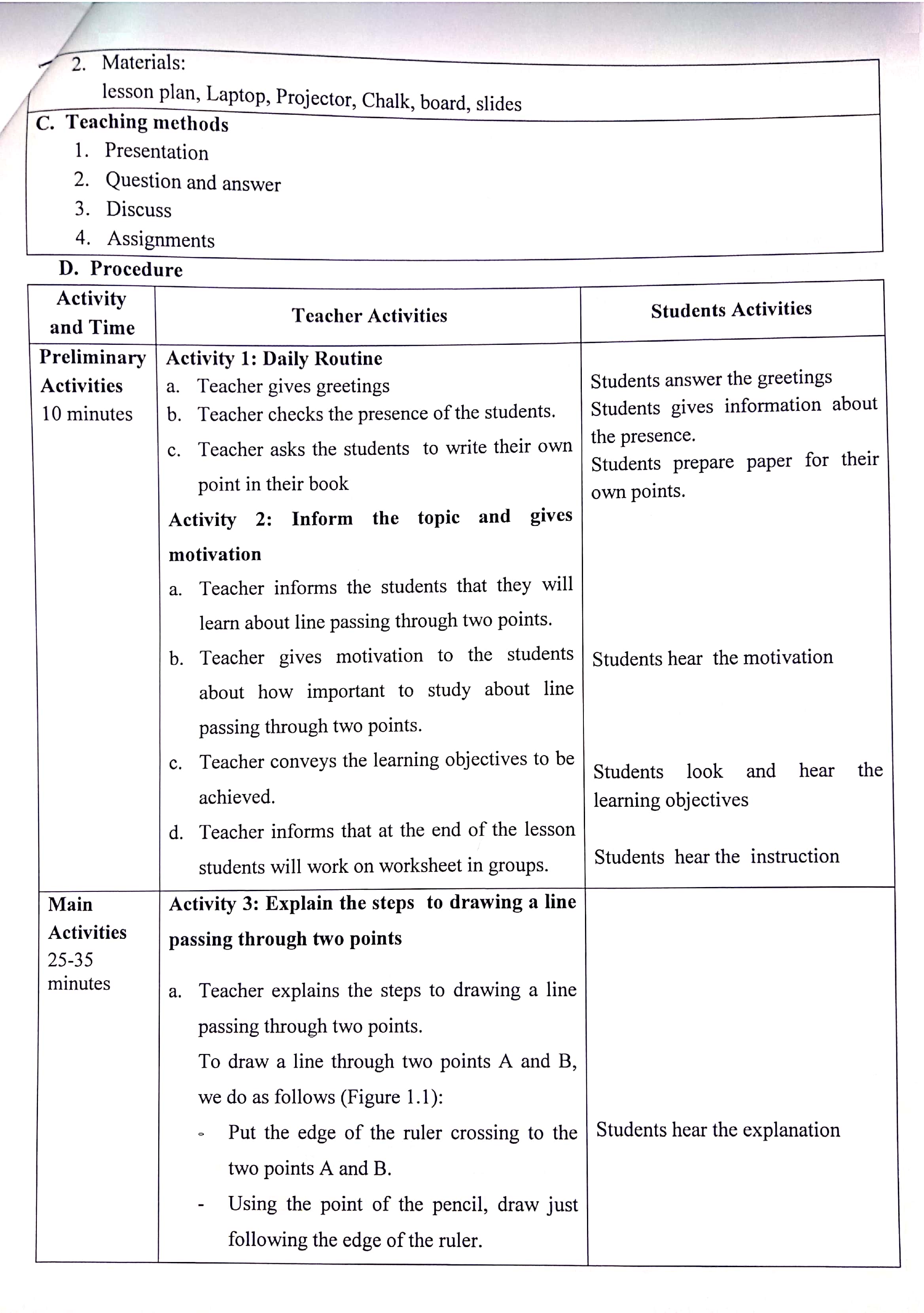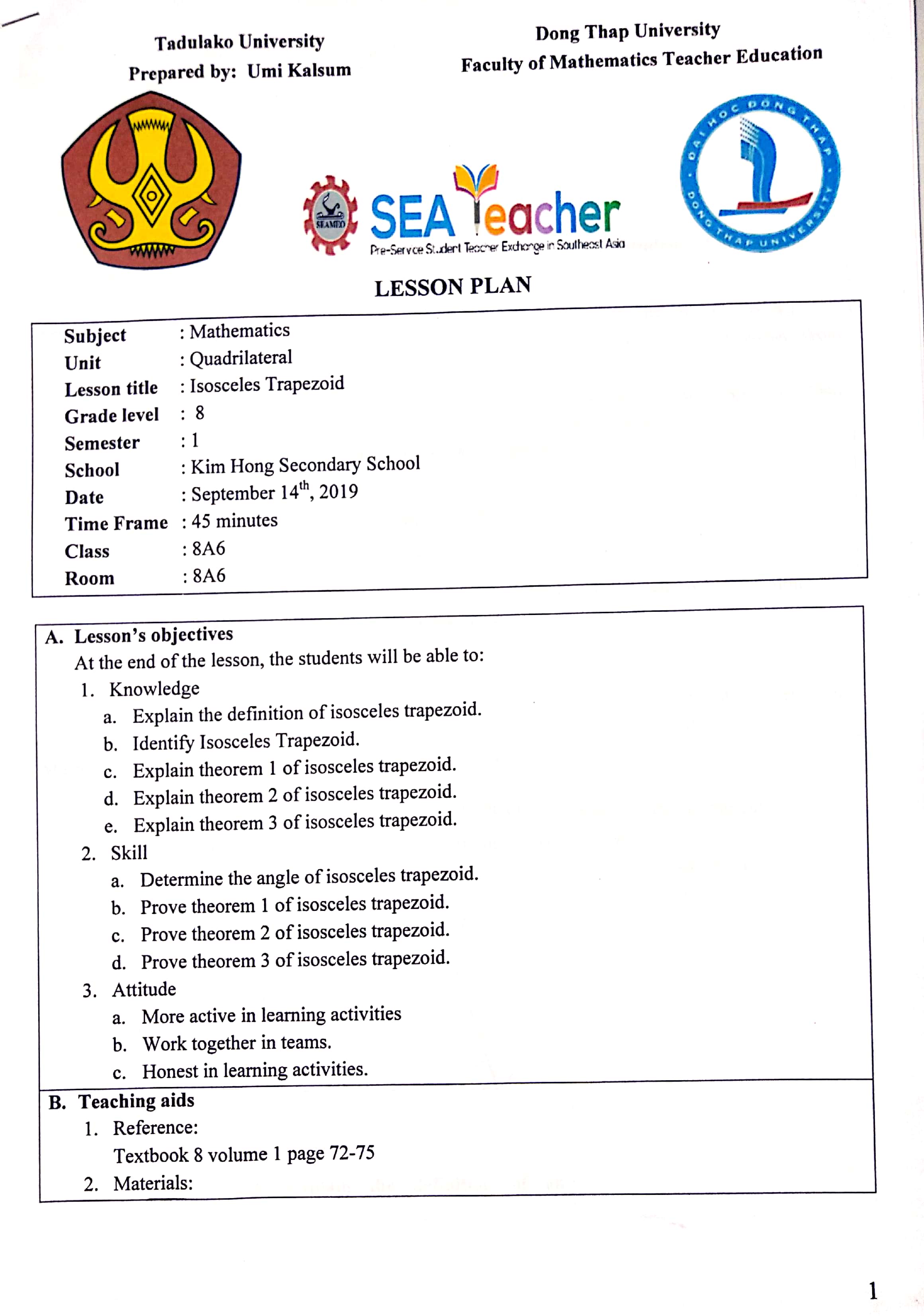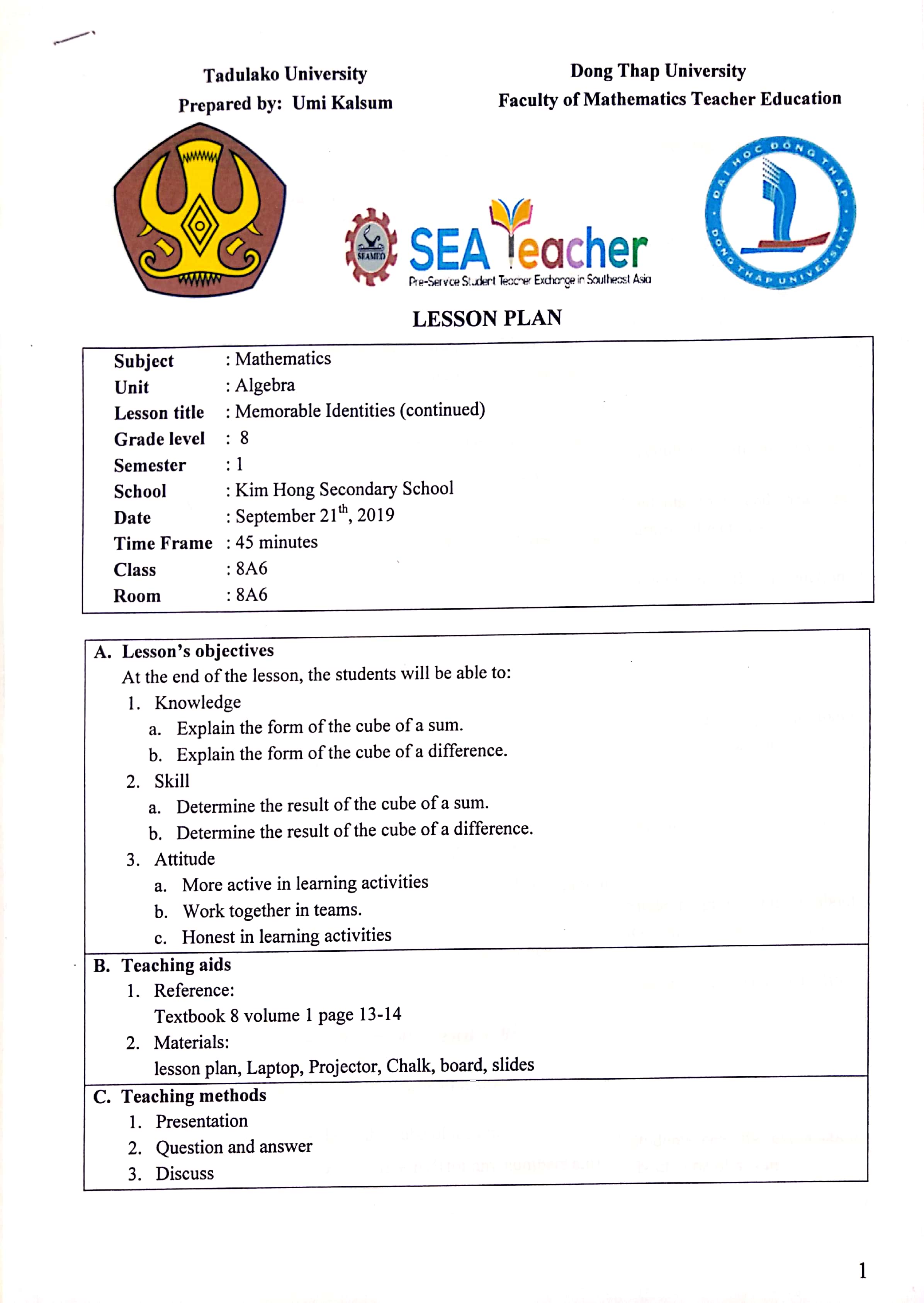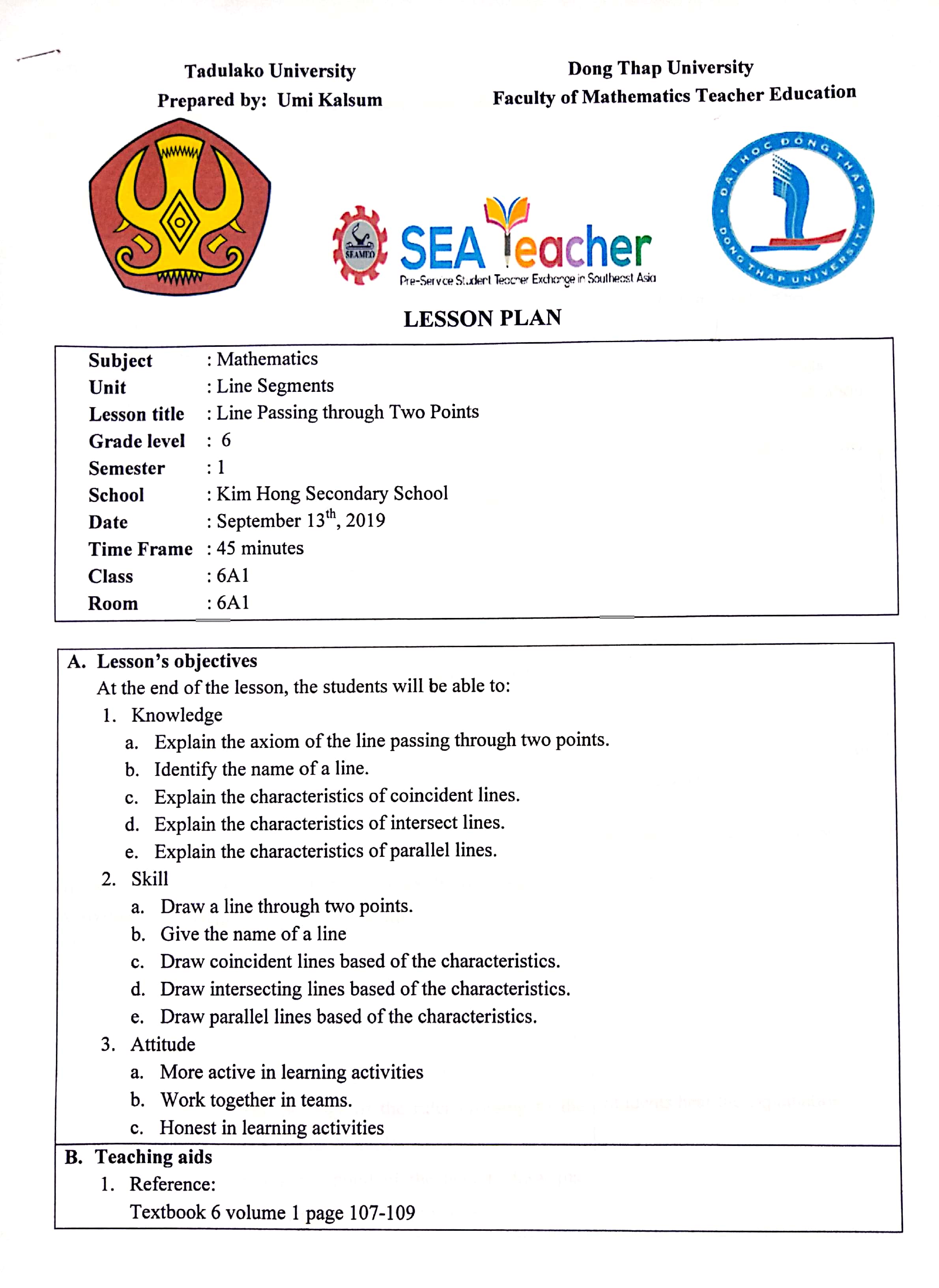 Based on the example given from my cooperating teacher and Đồng Tháp University (DThU), here are my lesson plan for teaching practice: